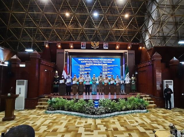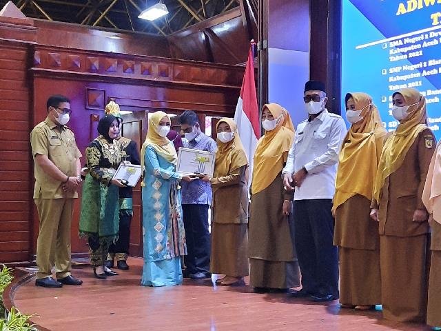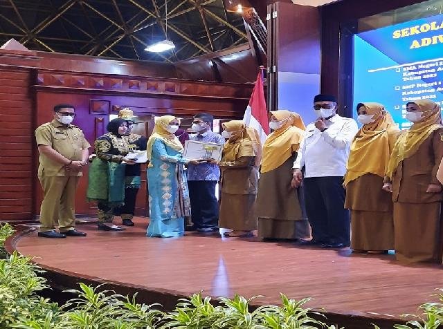 Penghargaan diterima oleh Hj. Asnaini, S.Pd., M.Pd selaku Kepala Sekolah SDN 22 Banda Aceh | Penyerahan Penghargaan Oleh Ketua TP PKK Aceh, Ny. Diah Erti Idawati didampingi Kadis LHK, A Hanan SP. MM |
